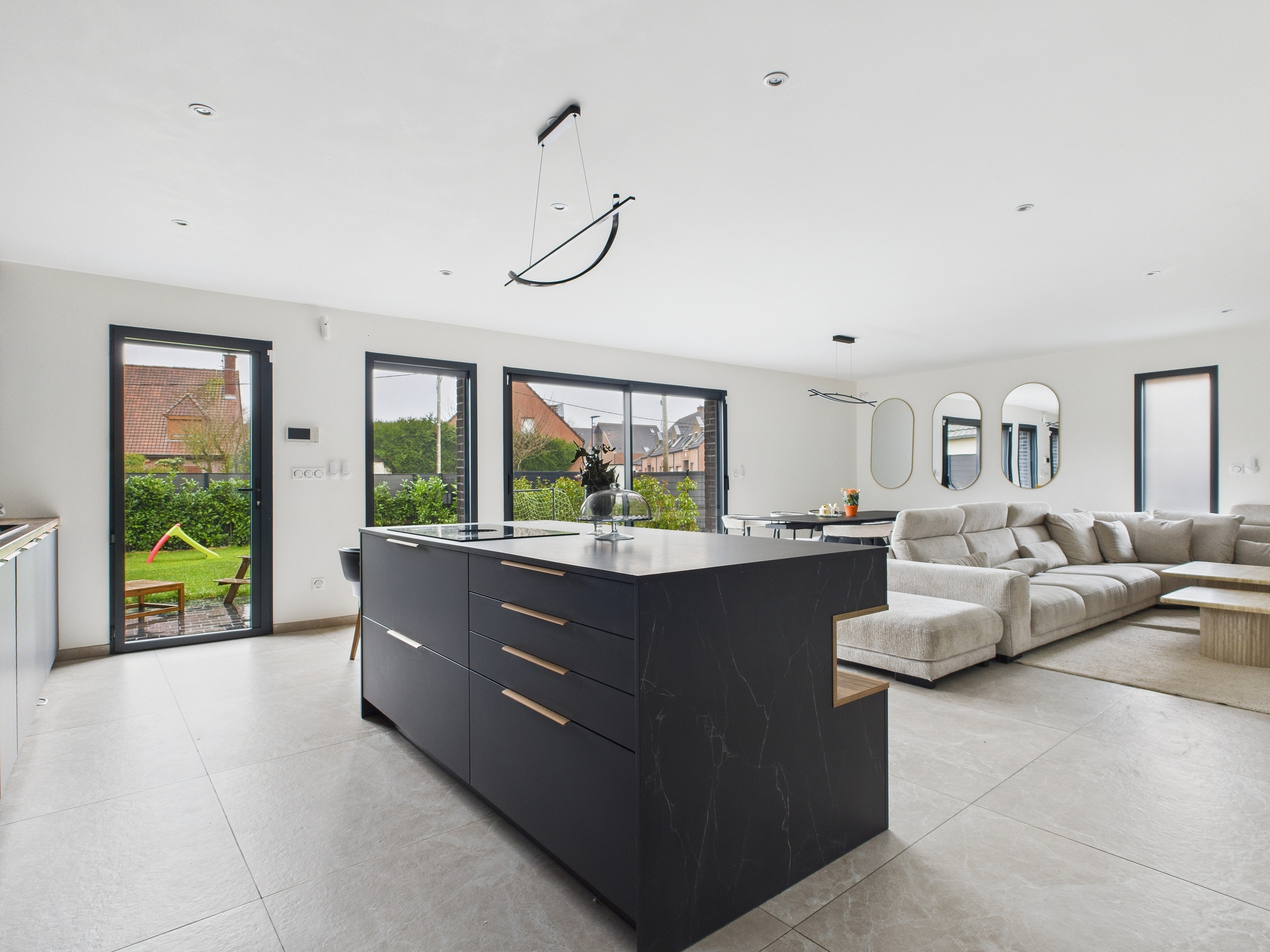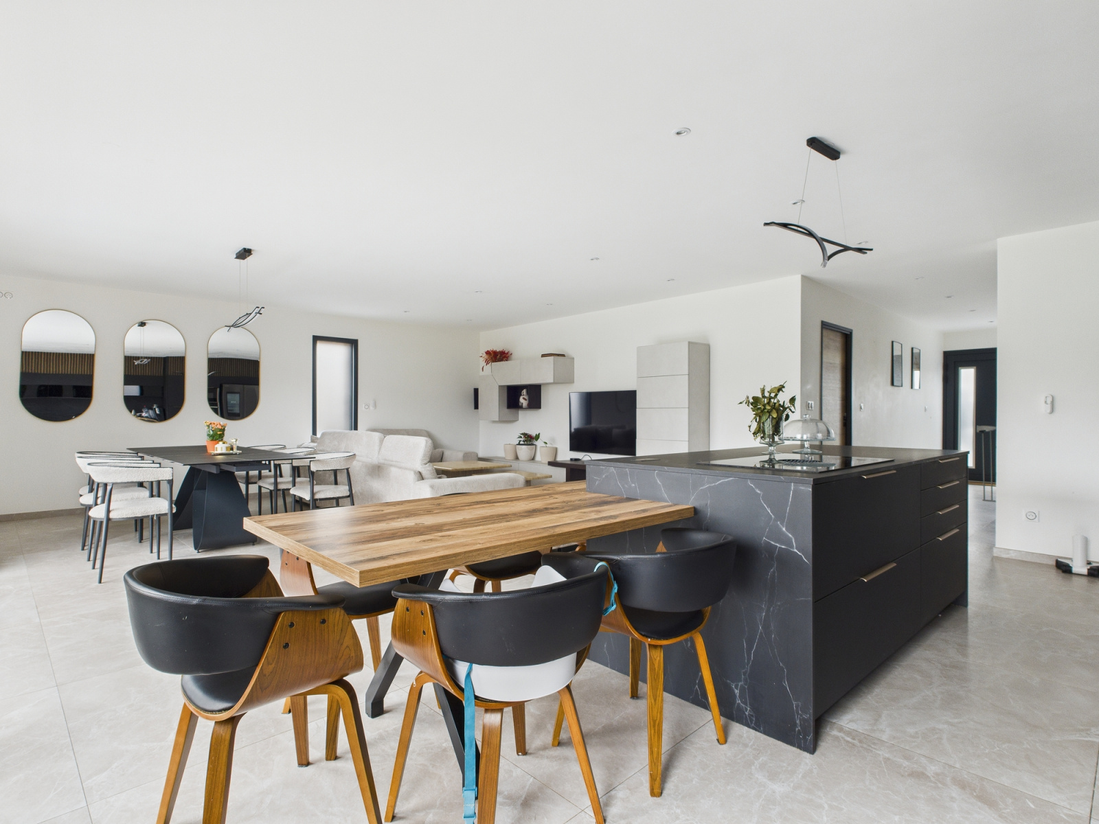 Dès l’entrée, la pièce de vie impressionne. Près de 60 m² parfaitement structurés pour accueillir un salon élégant, une salle à manger conviviale et une cuisine ouverte pensée comme un véritable espace de réception. Les perspectives sont belles, les volumes respirent, la circulation est fluide.