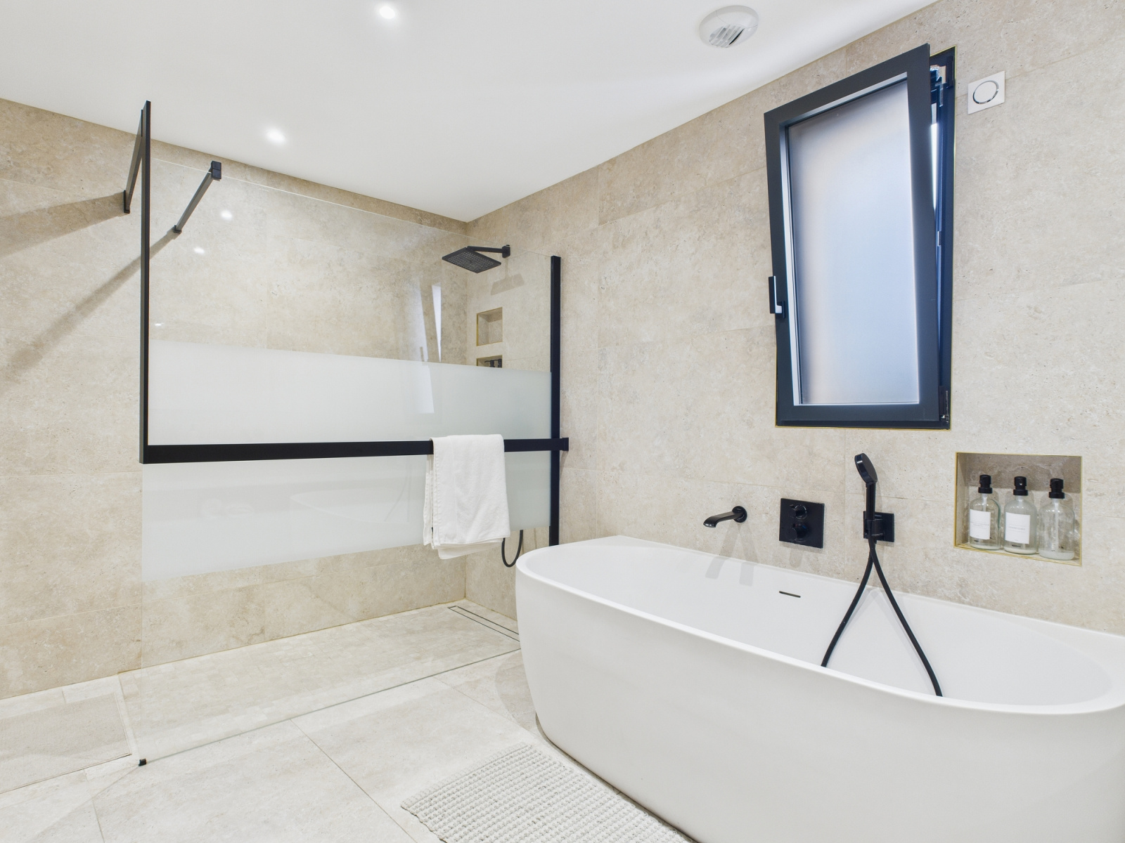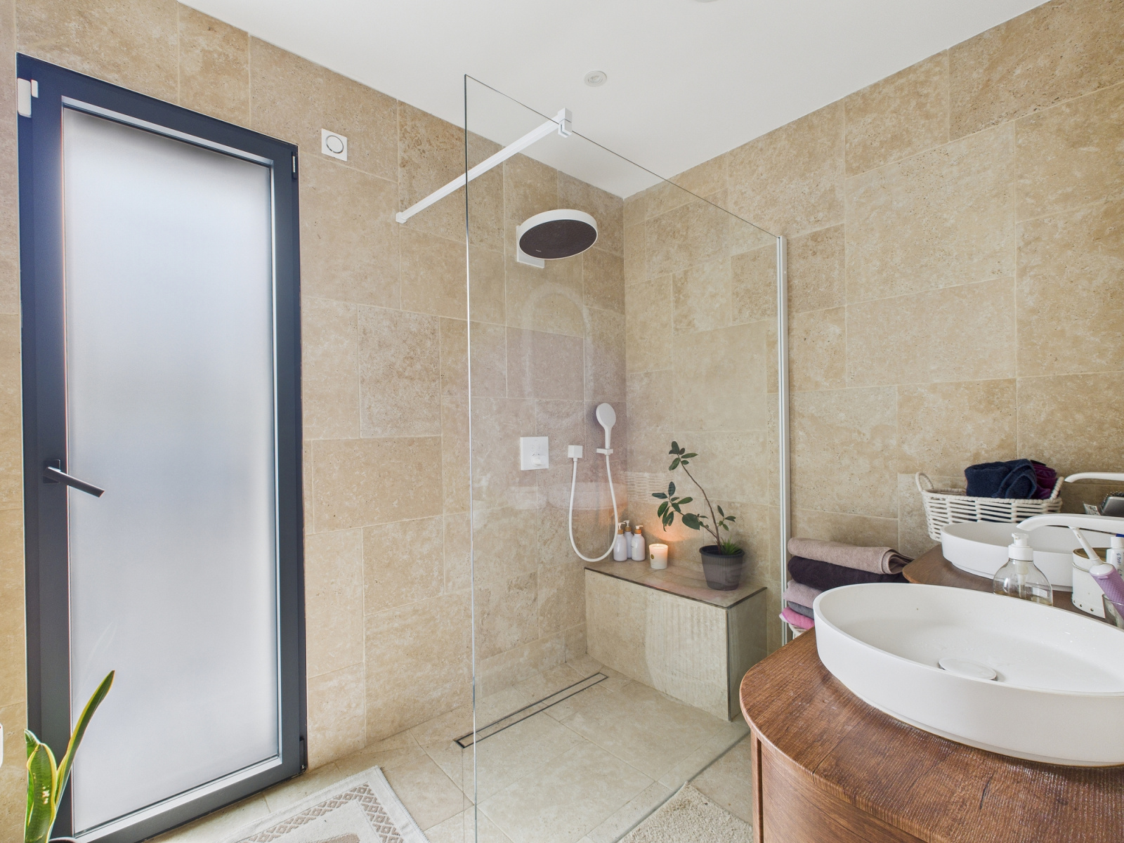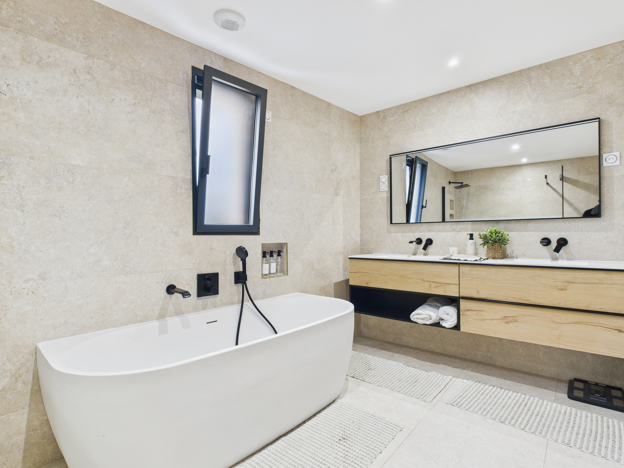 La salle de bains principale séduit par ses prestations complètes : baignoire, douche à l’italienne et double vasque, permettant un usage simultané confortable. Un second WC indépendant vient parfaire l’organisation de ce niveau.